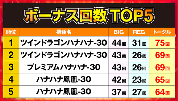 稀にみる大接戦のなかで頂点にたったのは、ボーナス回数が70回を上回った「ツインドラゴンハナハナ-30」の1台だ。