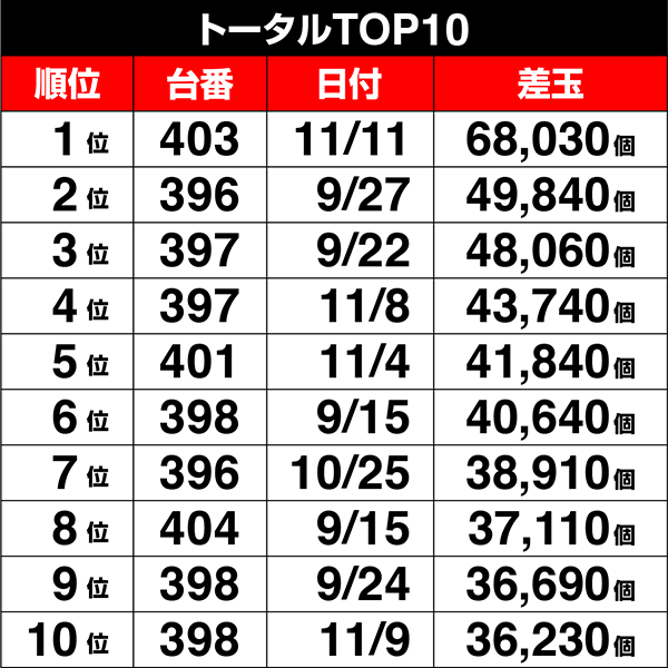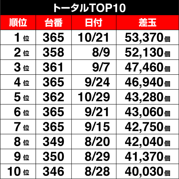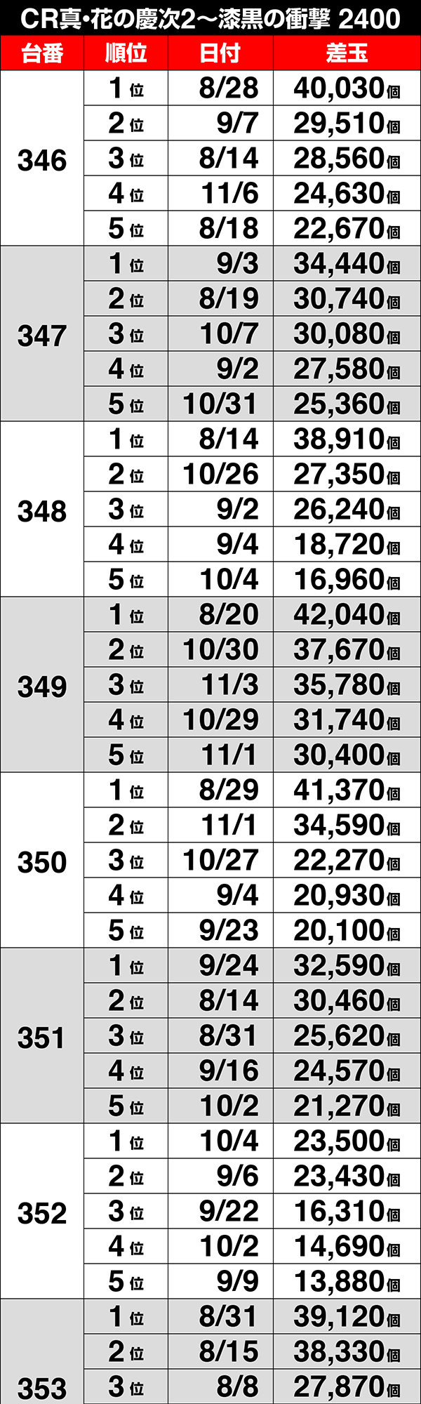 8月11日から11月12日(CR真・花の慶次2〜漆黒の衝撃 2400は11日)までの各台の差玉トップ5を公開! じっくりとチェックし、各台の傾向を分析しよう。