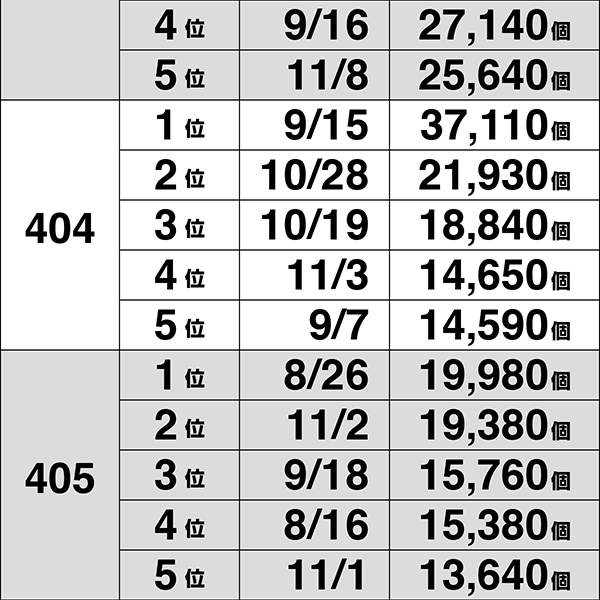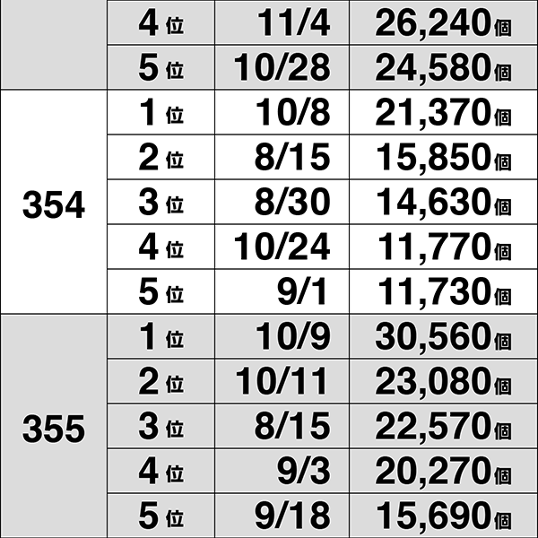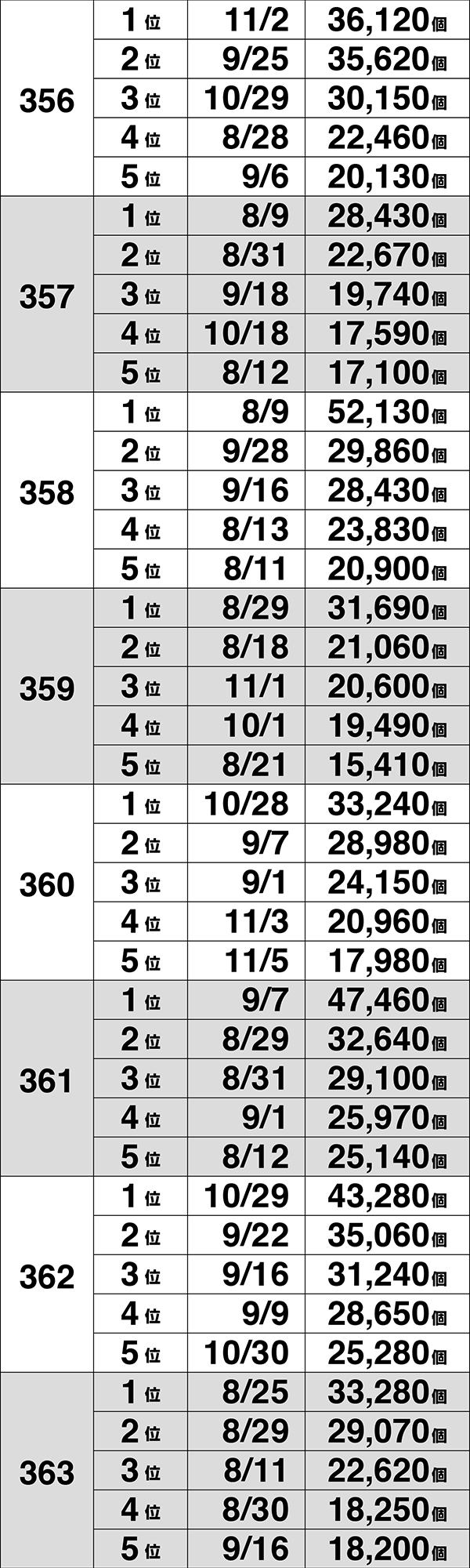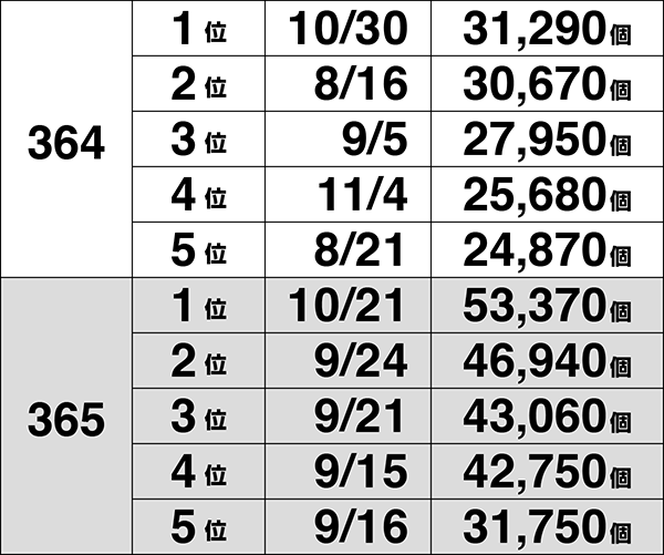 『CR真・花の慶次2〜漆黒の衝撃 2400』はTOP10すべてが40000ptを上回り、365番台と358番台が50000ptオーバー。