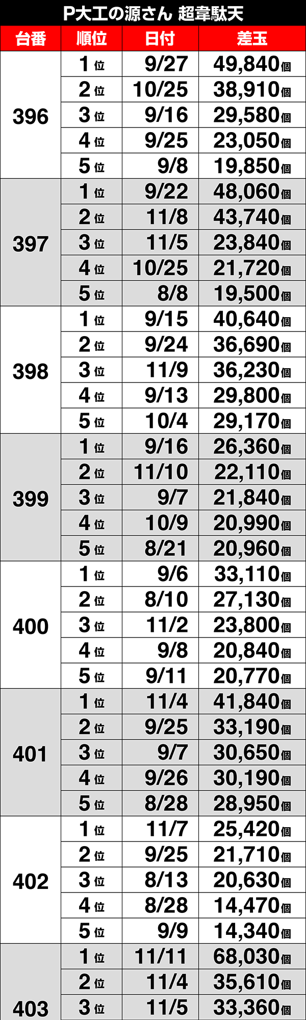 『P大工の源さん 超韋駄天』のランキングトップは403番台の+68030pt。