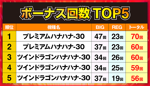 60回を記録した1台をはじめ、3位から5位には「ツインドラゴンハナハナ-30」が名を連ねた。
