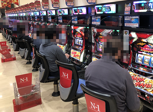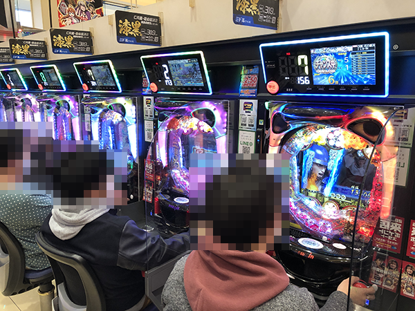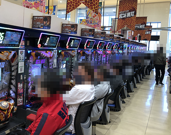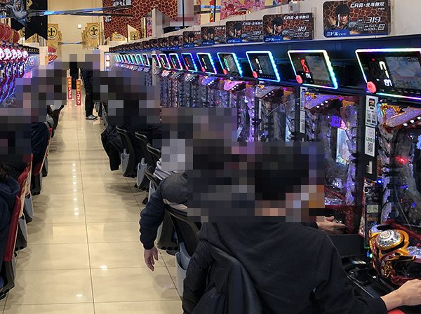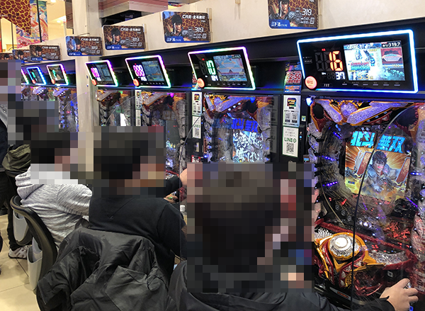 さまざまな機種が支持を集めていたなかでも、「ぱちんこCR真・北斗無双」の存在感がピカイチ! 笑顔で遊技をおこなう姿が多く、広がる光景はひときわ華やかだ。