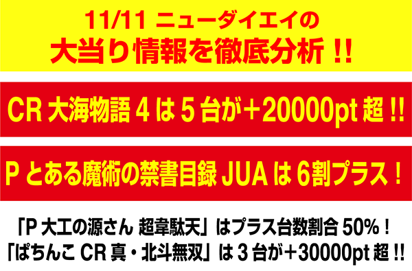 11月11日の日刊ぱちタウンは、パチンコとパチスロの総設置台数が561台を誇る「ニューダイエイ」をピックアップ。