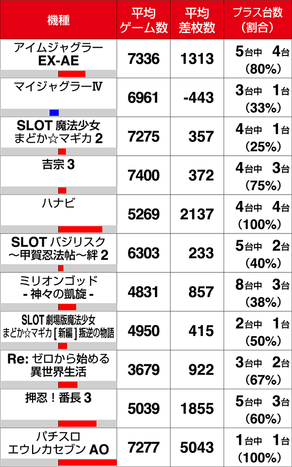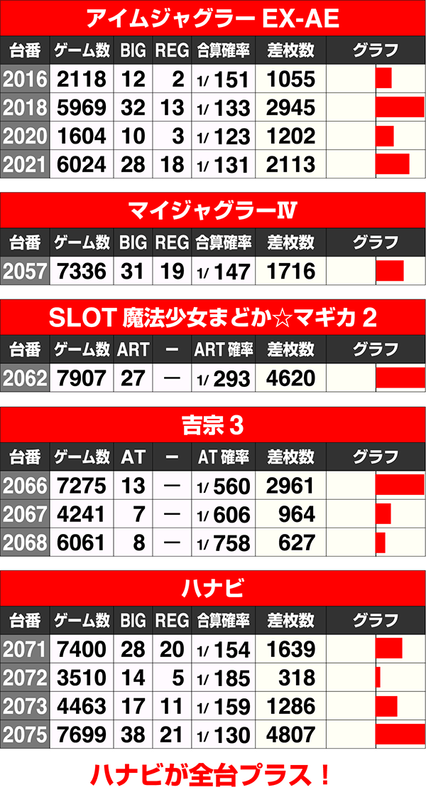 『アイムジャグラーEX-AE』は5台中4台、『吉宗3』は4台中3台がプラスと、好調台が目立った。