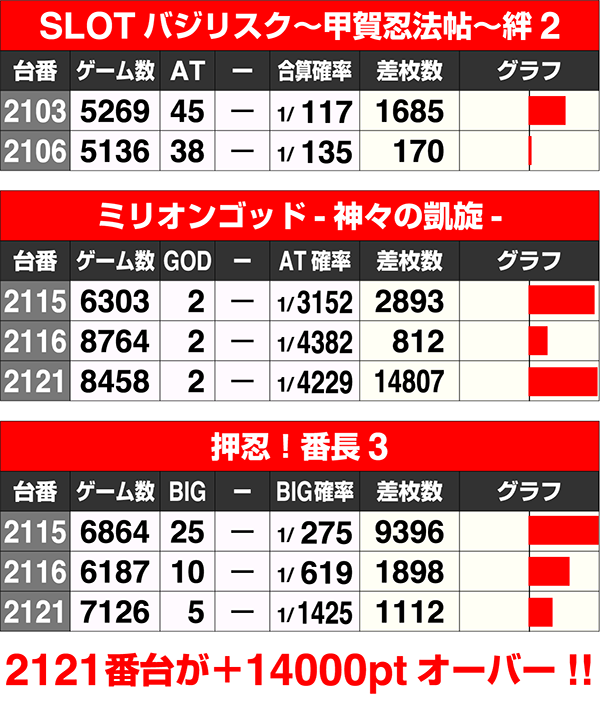 2121番台の『ミリオンゴッド-神々の凱旋-』は+14000ptオーバー。