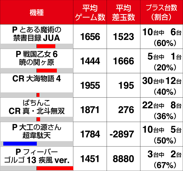 10台設置の『Pとある魔術の禁書目録JUA』と『P大工の源さん 超韋駄天』がプラス台数割合50%超。