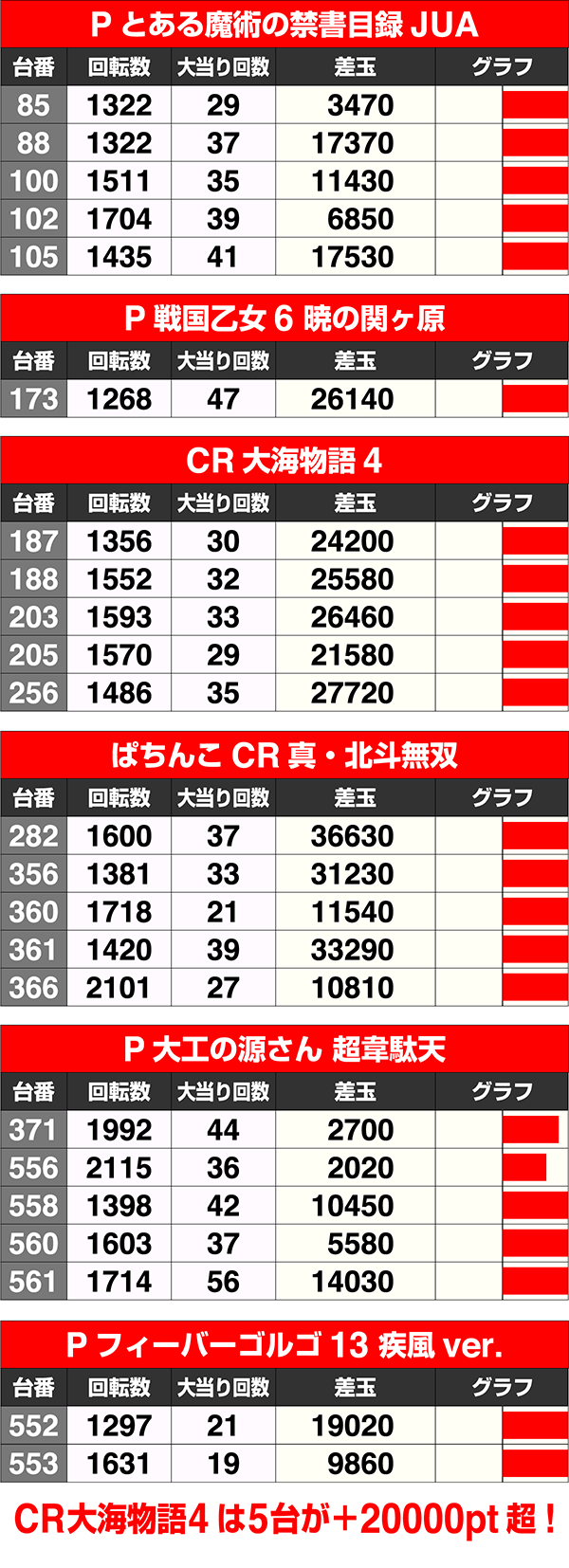『CR大海物語4』は5台が+20000ptオーバーを記録。