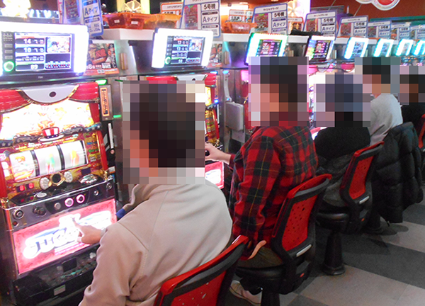 店内ではプレイヤーたちが楽しそうに遊技をおこなっており、パチンコとパチスロの両方がにぎやかな状況。