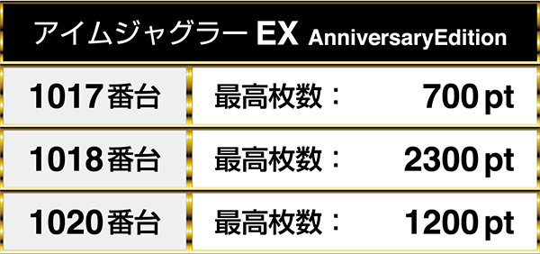 前回の降臨シリーズと同様に、今回も『マイジャグラーⅢ』と『アイムジャグラーEX AnniversaryEdition』にプラスptが連なる!!