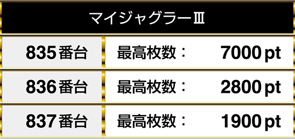 『マイジャグラーⅢ』の835番台から837番台までの3台が並んでプラスpt!