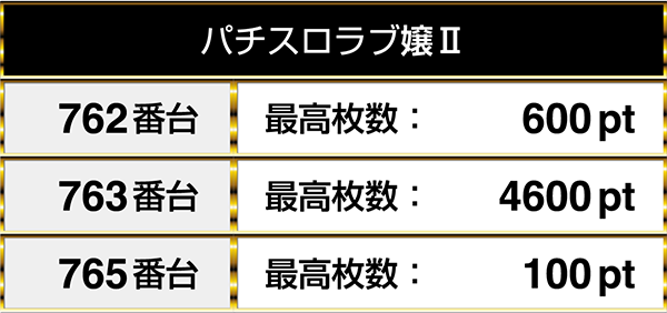 1日を通したデータをみると、3台以上の並びでプラスptとなる機種が複数あり、なかには7000ptや4600ptを記録する台もあった。
