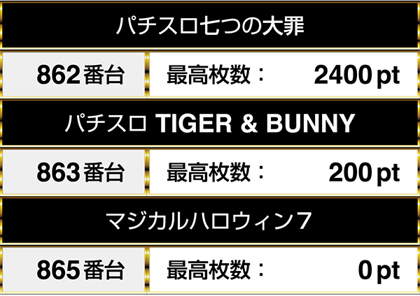 バラエティコーナーでは、『パチスロ七つの大罪』と『パチスロ TIGER & BUNNY』にプラスptが並んだ。