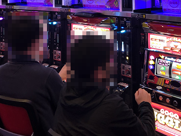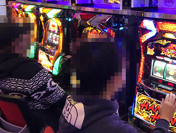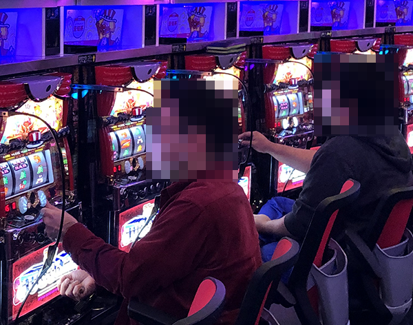 どちらのプレイヤーも笑顔でレバーを叩いており、遊技を満喫している様子。