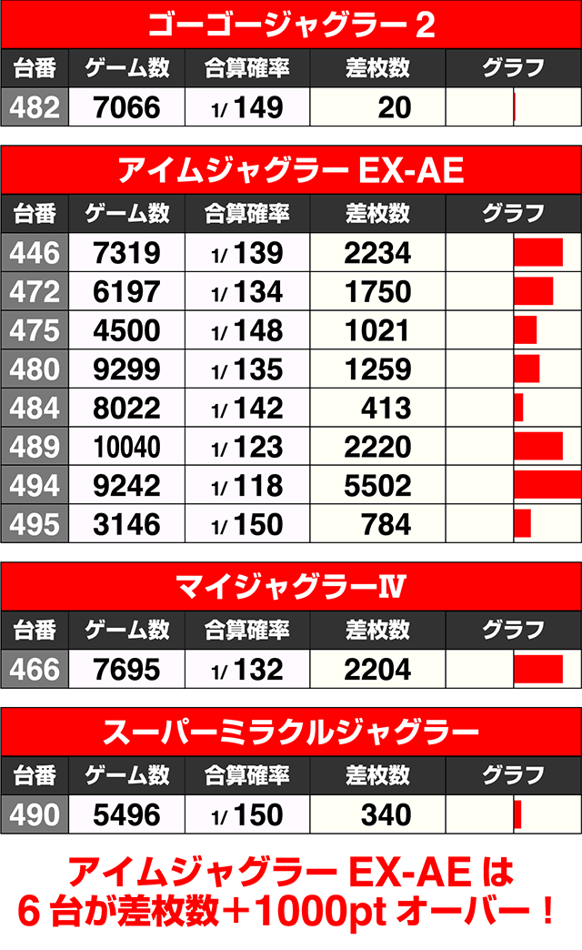 『アイムジャグラーEX-AE』は8台がプラス。5台の差枚数が+1000ptを上回ったなかで、494番台は+5502ptを記録。