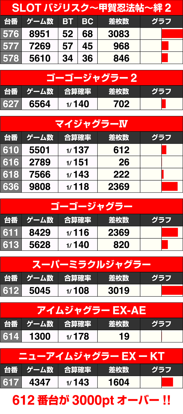 『SLOTバジリスク~甲賀忍法帖~絆2』は4台中3台がプラスで、576番台は+3000pt超。