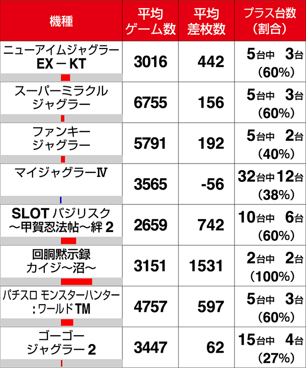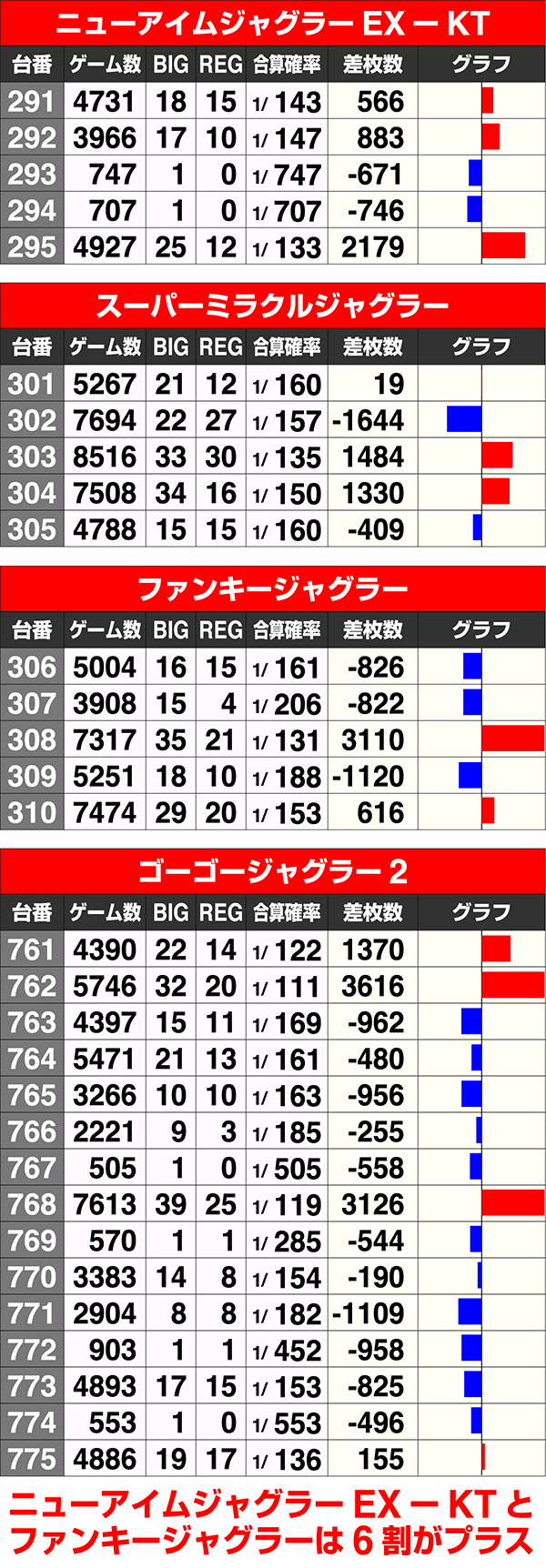 ジャグラーシリーズでは、『ニューアイムジャグラーEXーKT』と『スーパーミラクルジャグラー』が5台中3台と、6割がプラス。
