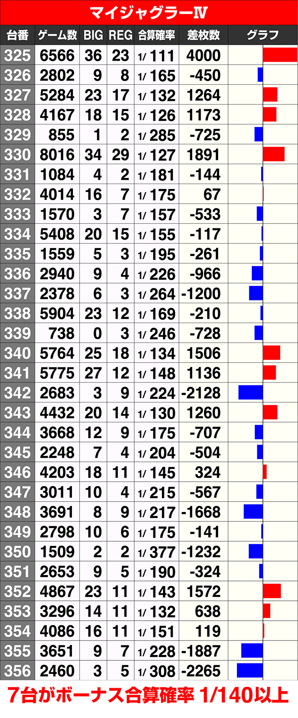 最多の設置台数を誇る『マイジャグラーⅣ』では、325番台が+4000ptを記録。