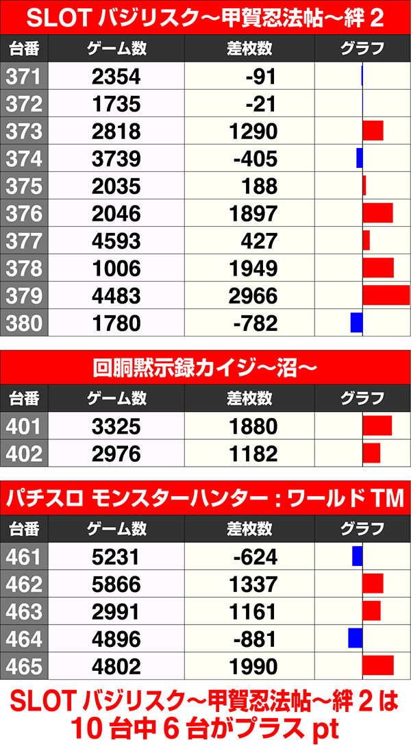 『SLOTバジリスク~甲賀忍法帖~絆2』の4台、2台設置の『回胴黙示録カイジ~沼~』は全台が+1000ptを超えた。