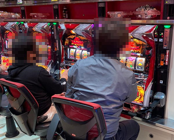9台中5台が稼働していた「ツインドラゴンハナハナ-30」で、華麗なパフォーマンスを披露している姿を確認。うれしそうな笑顔からは、機種の魅力を堪能していることがうかがえた。