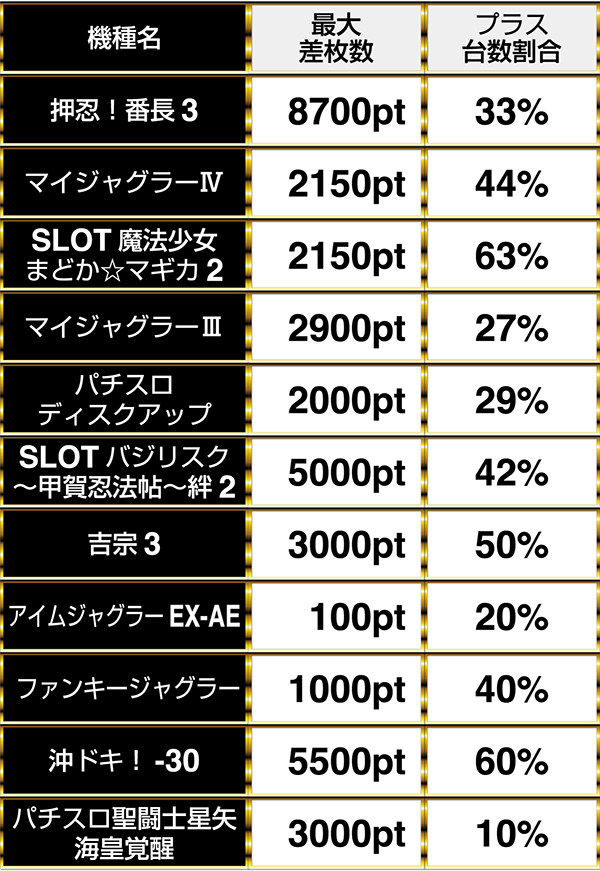 人気を集めていた『マイジャグラーⅣ』は、25台中11台がプラスptを記録した。
