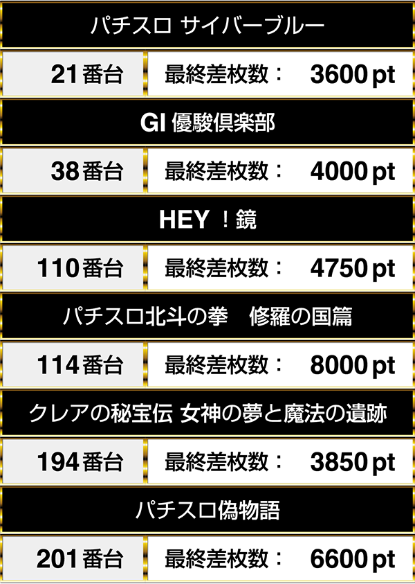 『HEY!鏡』の110番台は4750pt、『パチスロ偽物語』の201番台は6000ptを上回る!!
