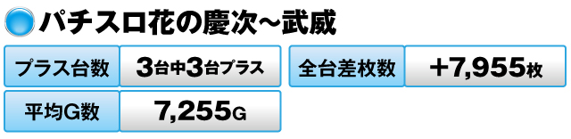 3台すべてがプラスで全台差枚数は+7,955枚、平均G数は7,255Gを記録した。