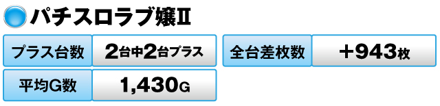 『パチスロラブ嬢Ⅱ』も、2台すべてがプラスで全台差枚数が+943枚と健闘した。