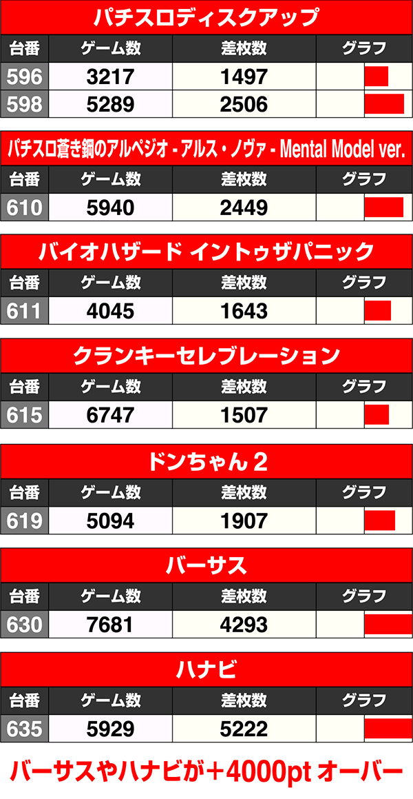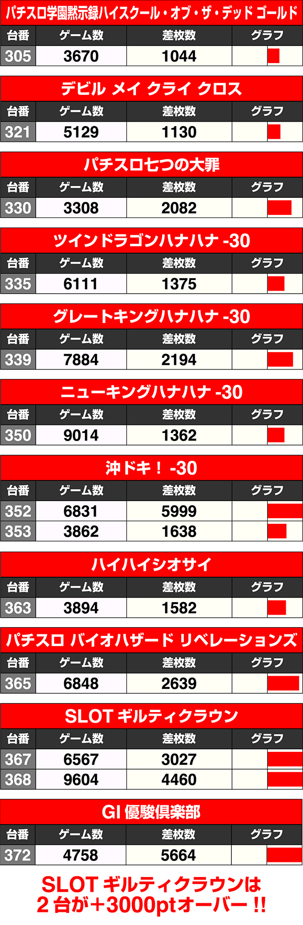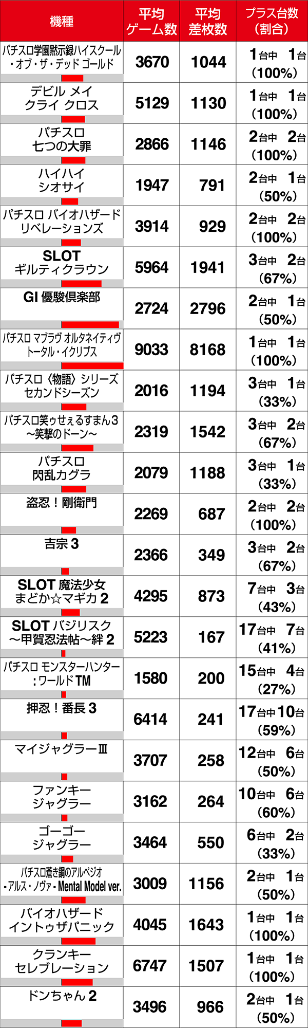 『SLOTギルティクラウン』は3台中2台が3000ptを超え、平均差枚数は+1941pt。