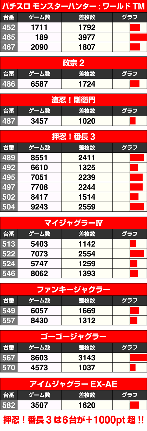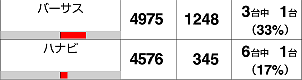 2台設置の『パチスロ七つの大罪』や『盗忍!剛衛門』は2台がともにプラス。
