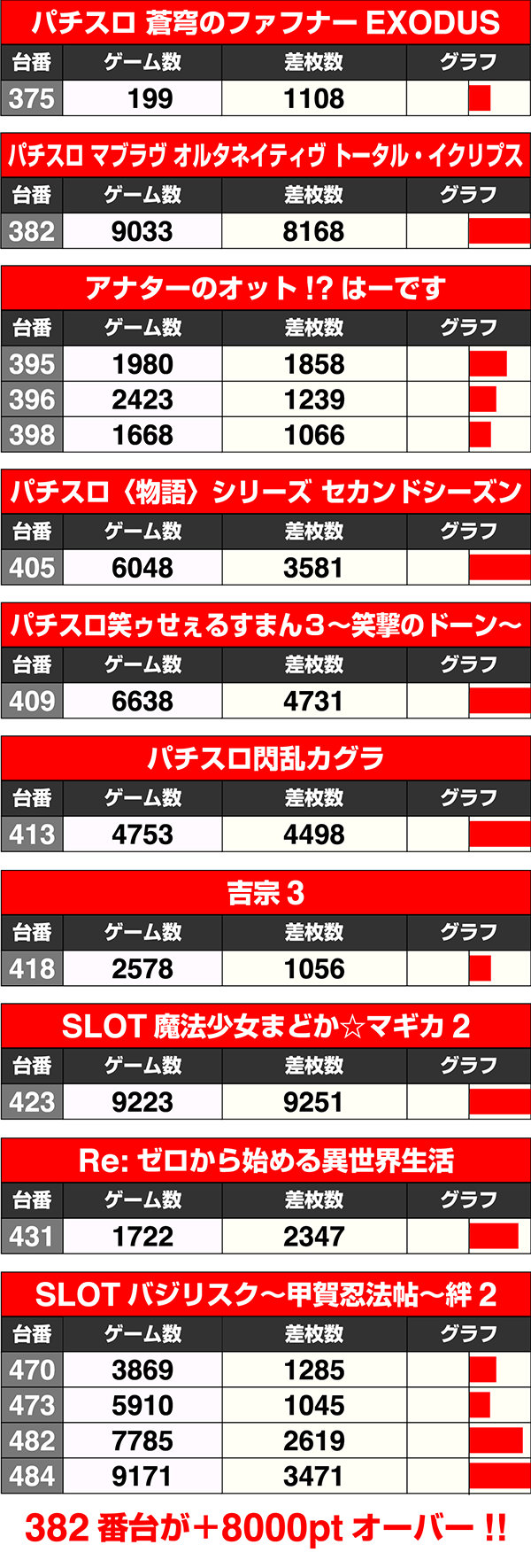 382番台の『パチスロ マブラヴ オルタネイティヴ トータル・イクリプス』は+8000ptを超えた。