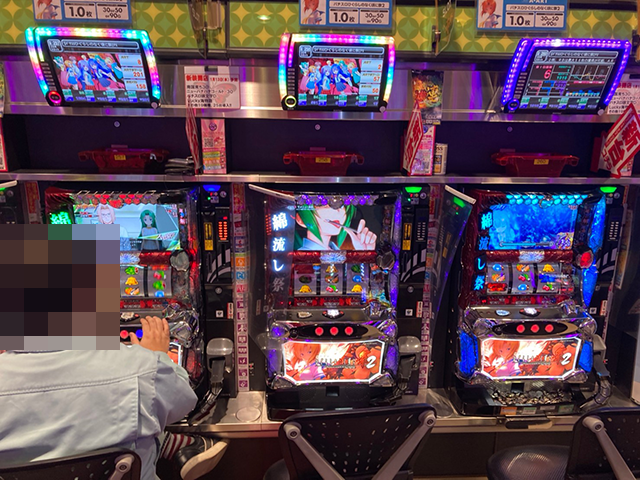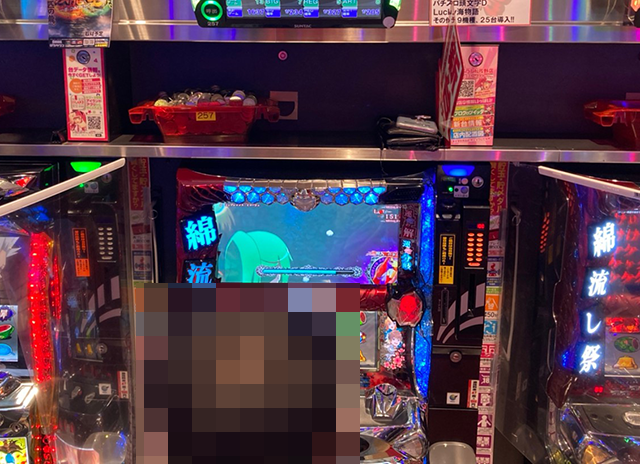 パチスロコーナーを歩いていくと、新機種の「パチスロひぐらしのなく頃に祭2」でパフォーマンスを披露しているプレイヤーを目撃。