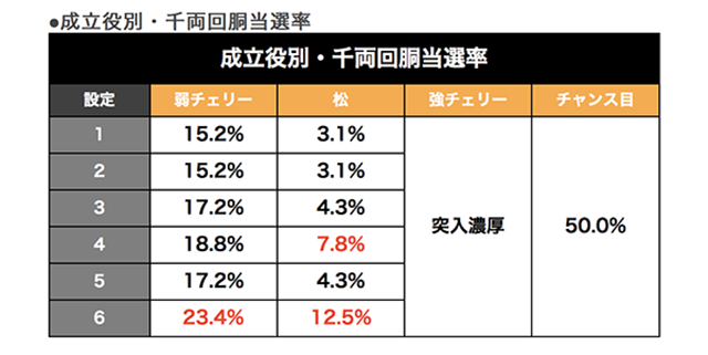 通常時は特定役からの千両回胴当選率に注目で、弱チェリーからの当選率は高設定ほど高く、松からの当選率は設定4と6が高い。