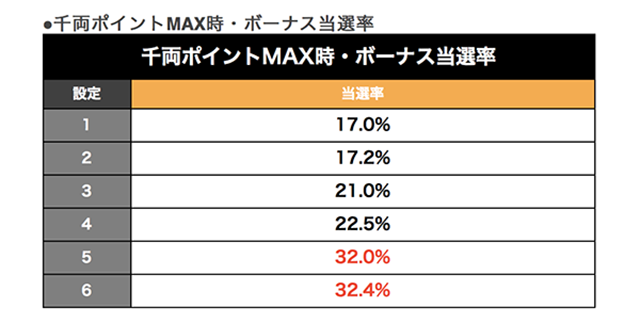 千両ポイントMAX時のボーナス当選率も設定差が大きく、設定5と6はおよそ3回に1回の頻度でボーナスに当選する。