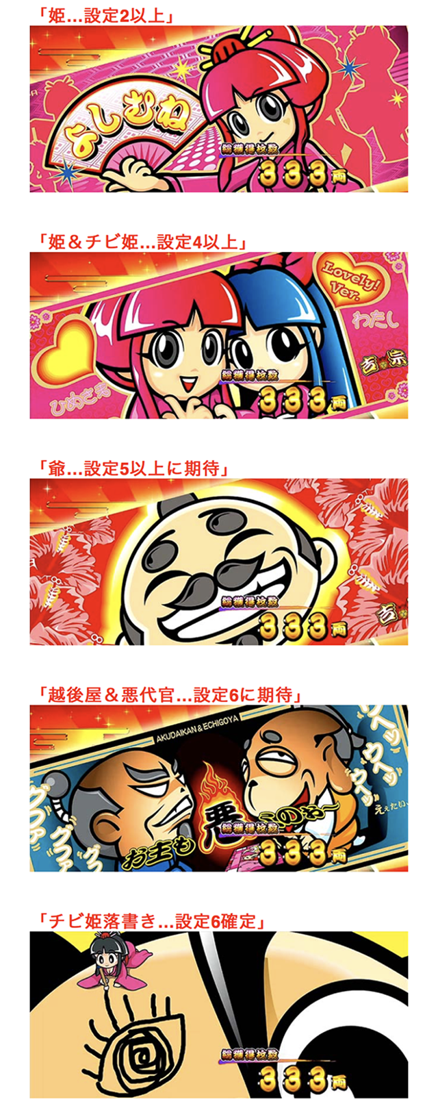 また、ボーナス終了画面に設定差が存在し、姫ならば設定2以上、チビ姫落書きならば設定6が濃厚だ。