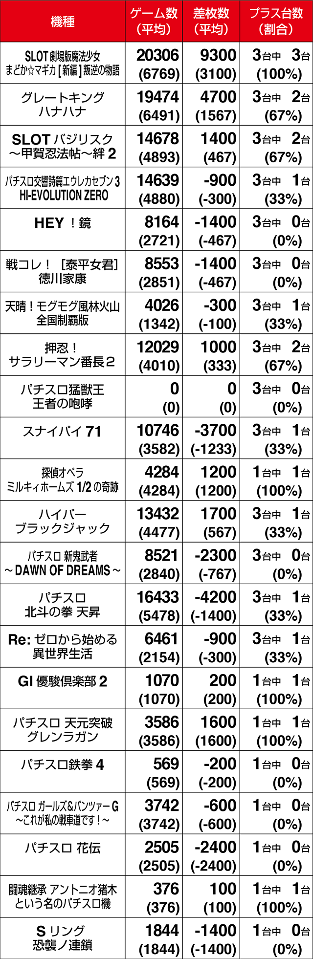 『SLOT劇場版魔法少女まどか☆マギカ[新編]叛逆の物語』は3台すべてがプラス。平均ゲーム数は6700Gを上回り、平均差枚数は+3000ptを超えた。