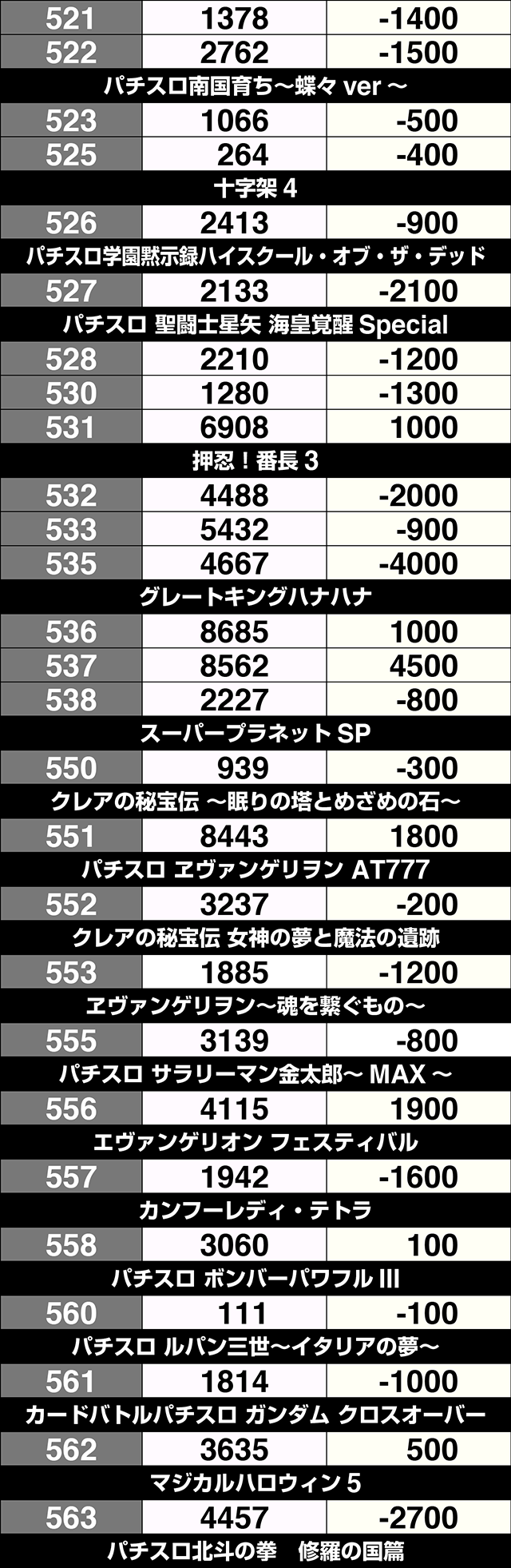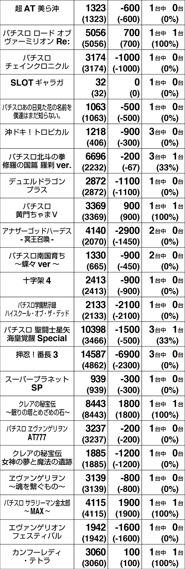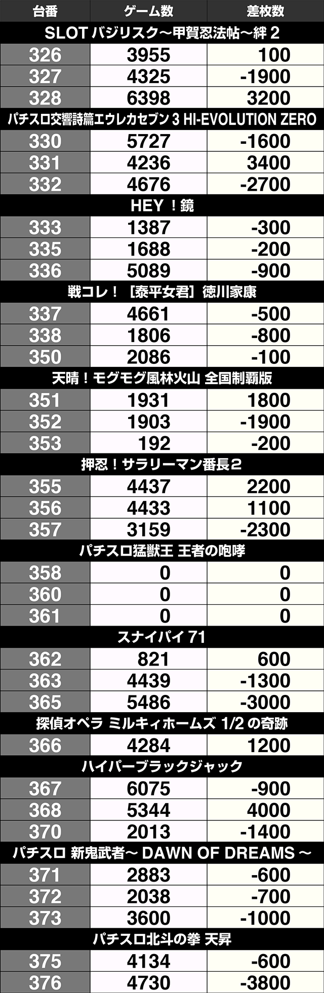 同じく3台設置の『ハイパーブラックジャック』や『パチスロ交響詩篇エウレカセブン3 HI-EVOLUTION ZERO』にも+3000ptを超える好調台を確認した。