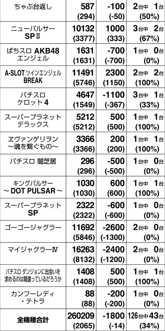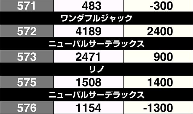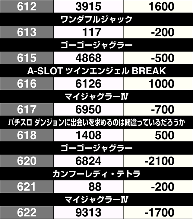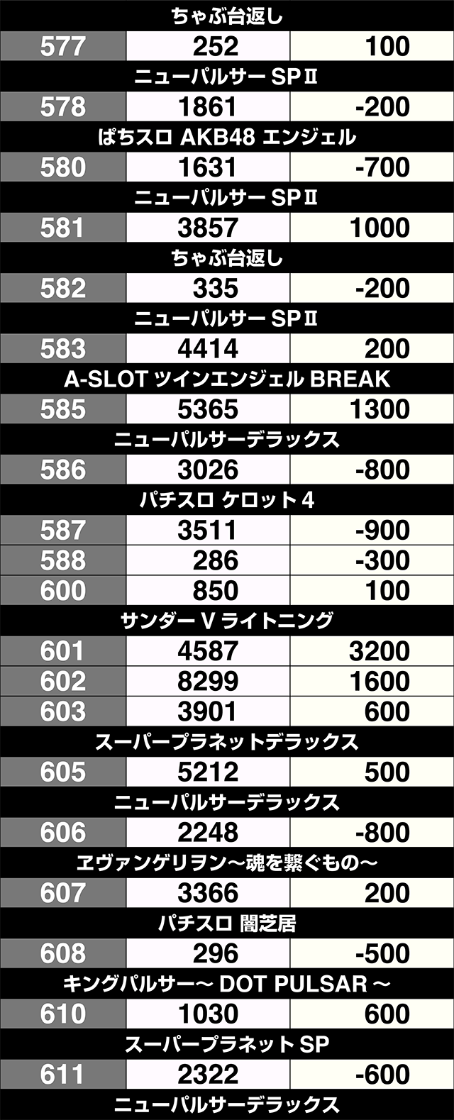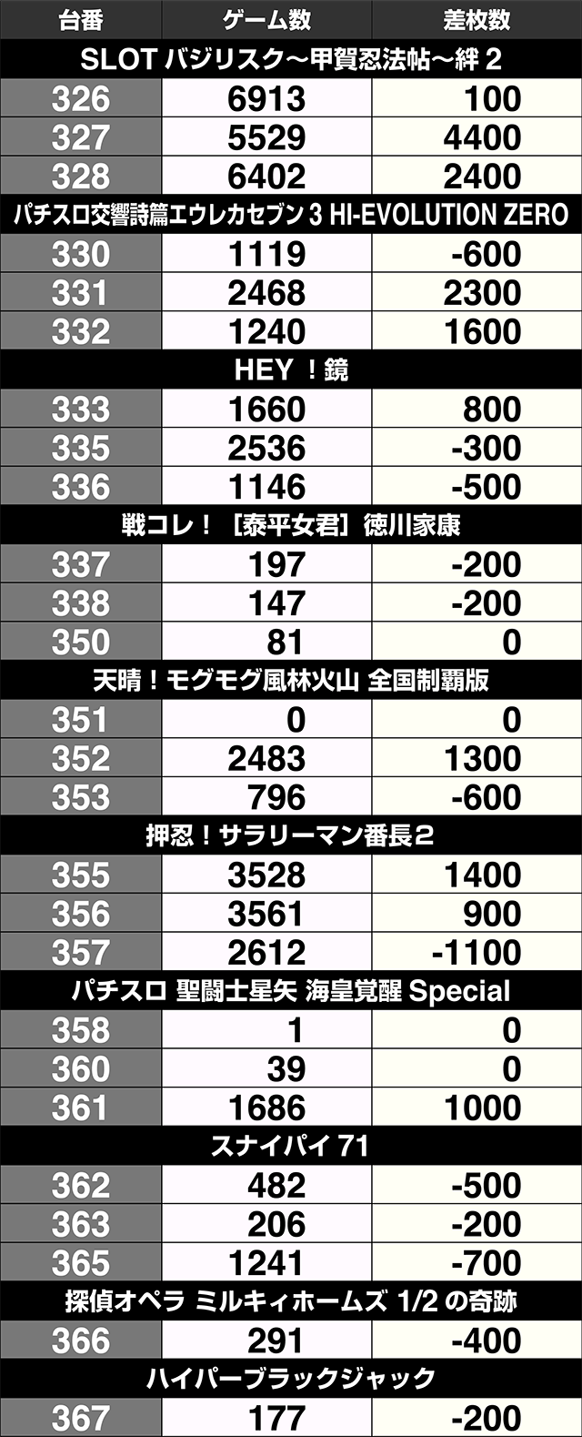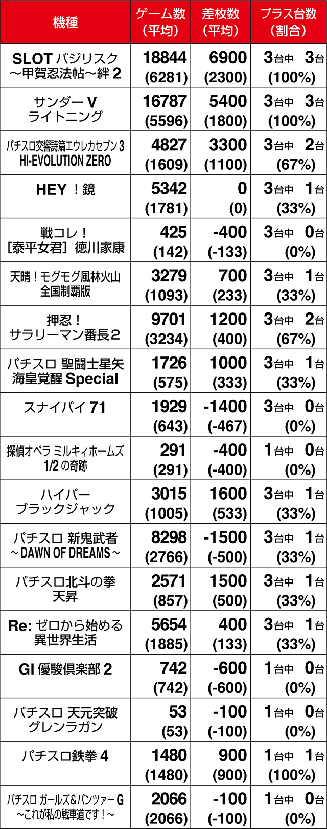 3台設置の『SLOTバジリスク~甲賀忍法帖~絆2』が全台プラス。3000ptオーバーの601番台を筆頭に、『サンダーVライトニング』も3台すべてがプラス差枚数を記録した。