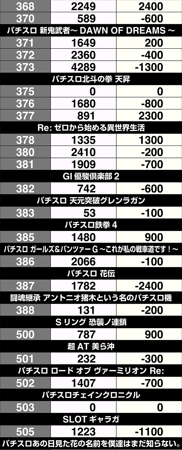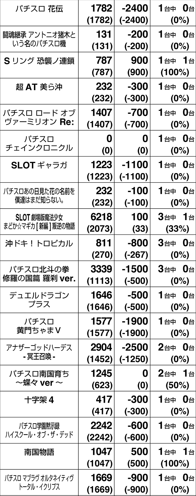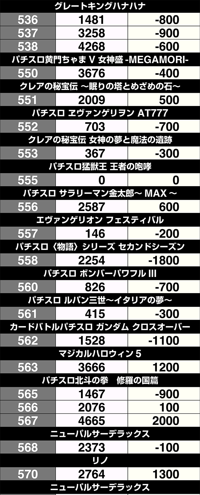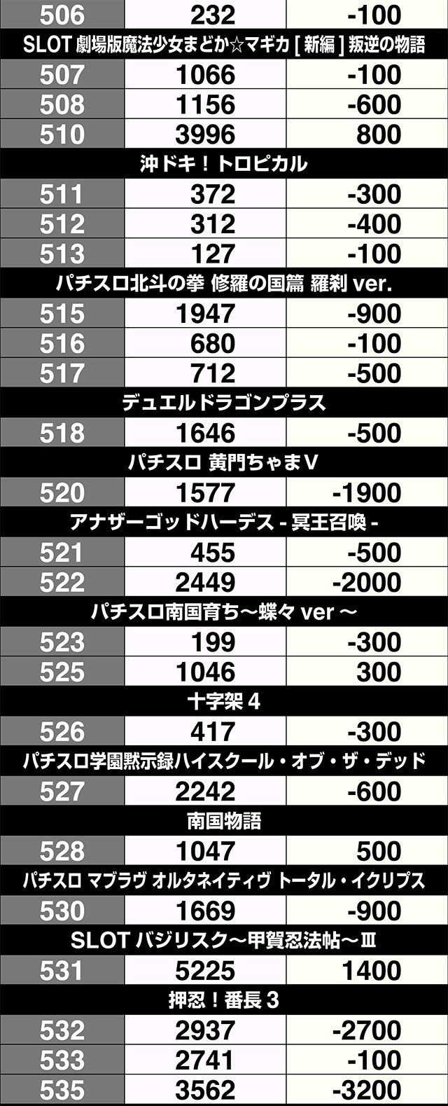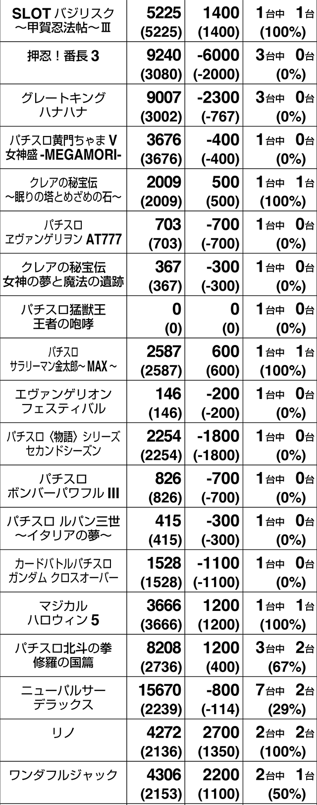 3台設置の『SLOTバジリスク~甲賀忍法帖~絆2』が全台プラス。3000ptオーバーの601番台を筆頭に、『サンダーVライトニング』も3台すべてがプラス差枚数を記録した。