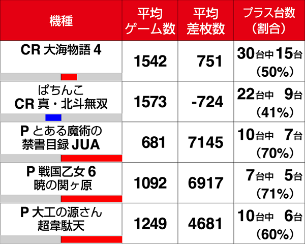 10台設置されている『Pとある魔術の禁書目録JUA』や『P大工の源さん 超韋駄天』は6割以上がプラスであった。