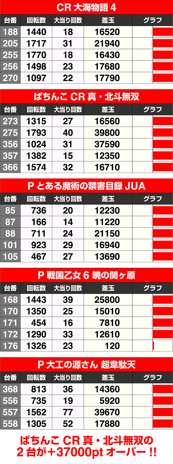 『ぱちんこCR真・北斗無双』は6台以上が+10000ptを上回り、2台が+37000ptオーバー。