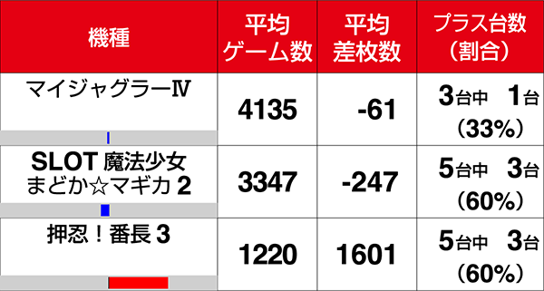 『SLOT魔法少女まどか☆マギカ2』と『押忍!番長3』は5台中3台がプラス。