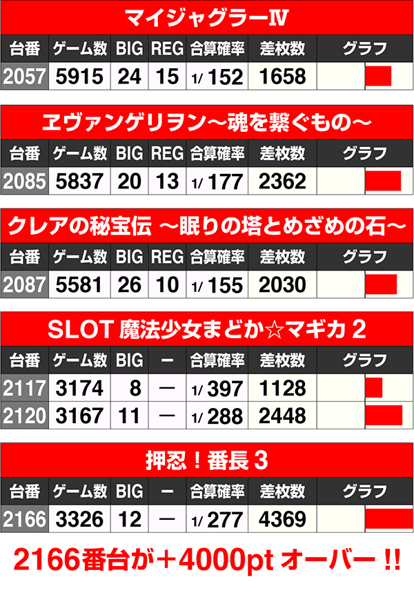 2166番台の『押忍!番長3』は+4000ptを上回った。