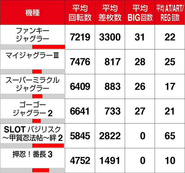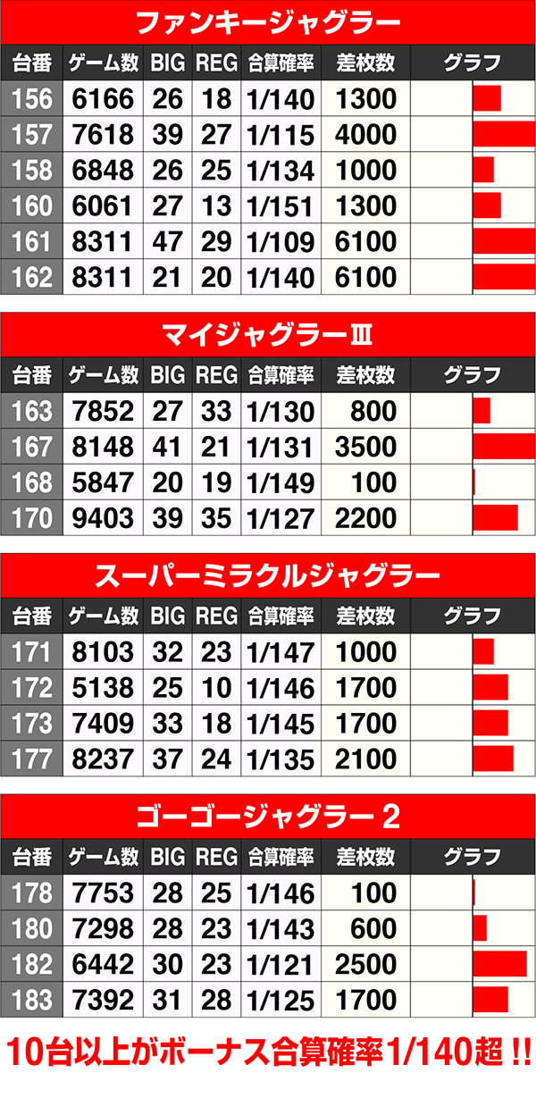 『マイジャグラーⅢ』、『スーパーミラクルジャグラー』、『ゴーゴージャグラー2』の3機種はそれぞれ4台がプラスを記録した。