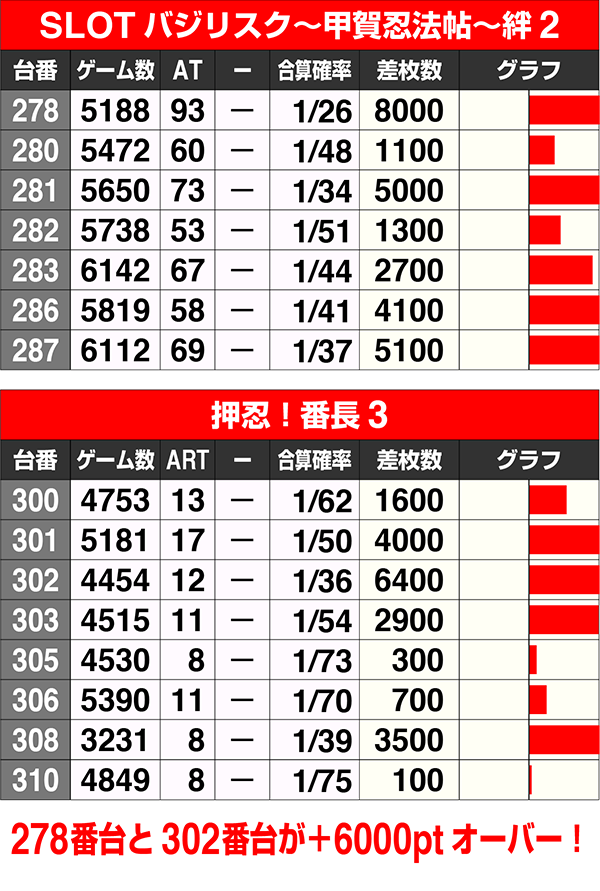 『SLOTバジリスク~甲賀忍法帖~絆2』は7台がプラスで平均差枚数+2822pt。8台がプラスの『押忍!番長3』も、302番台が6000ptを上回るなど好調台が目立った。