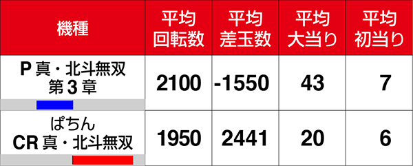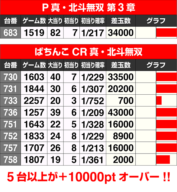 17台設置の『ぱちんこCR真・北斗無双』は8台がプラスで、5台が10000ptを上回った。