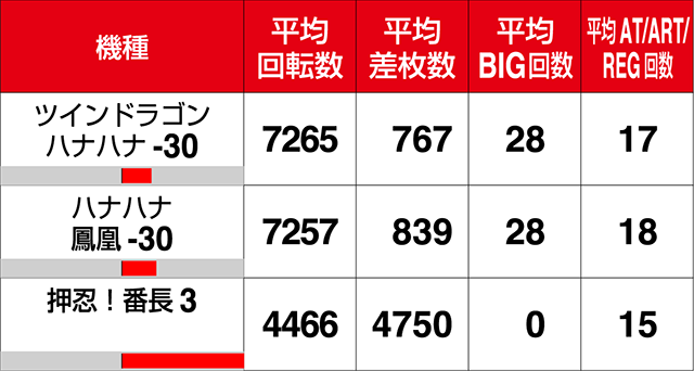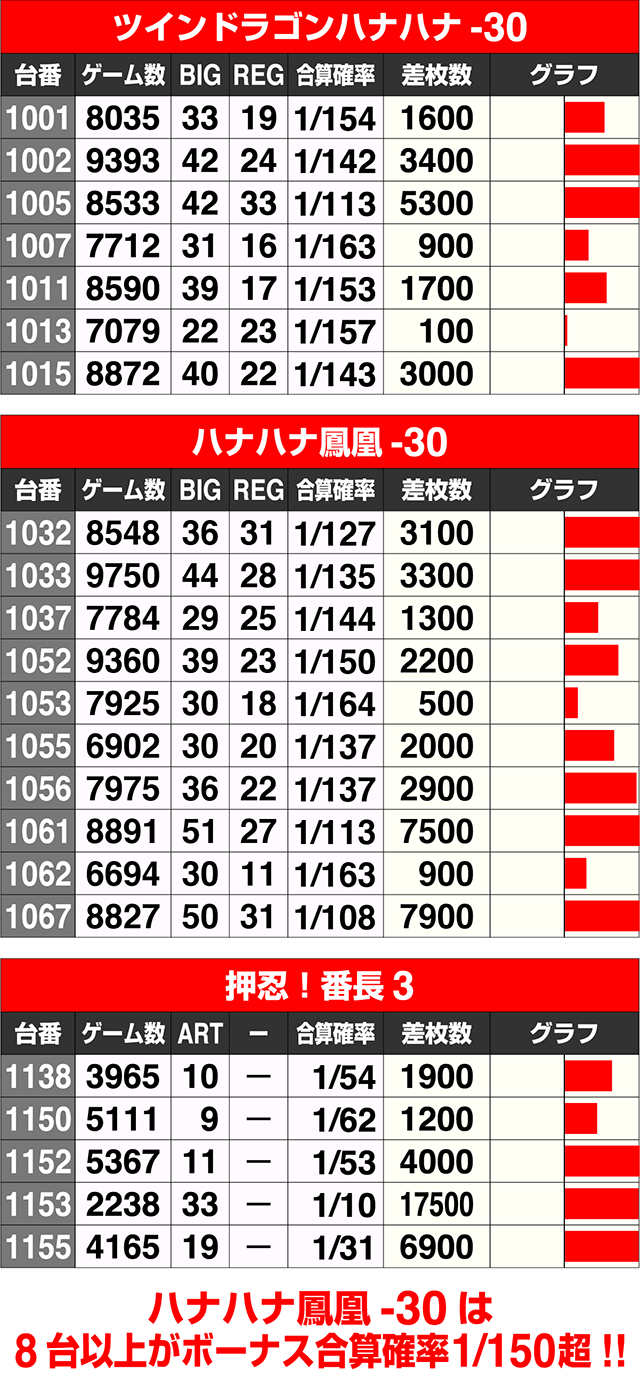 『ハナハナ鳳凰-30』は8台がボーナス合算確率1/150を上回り、2台の差枚数が+7000ptを超えた。