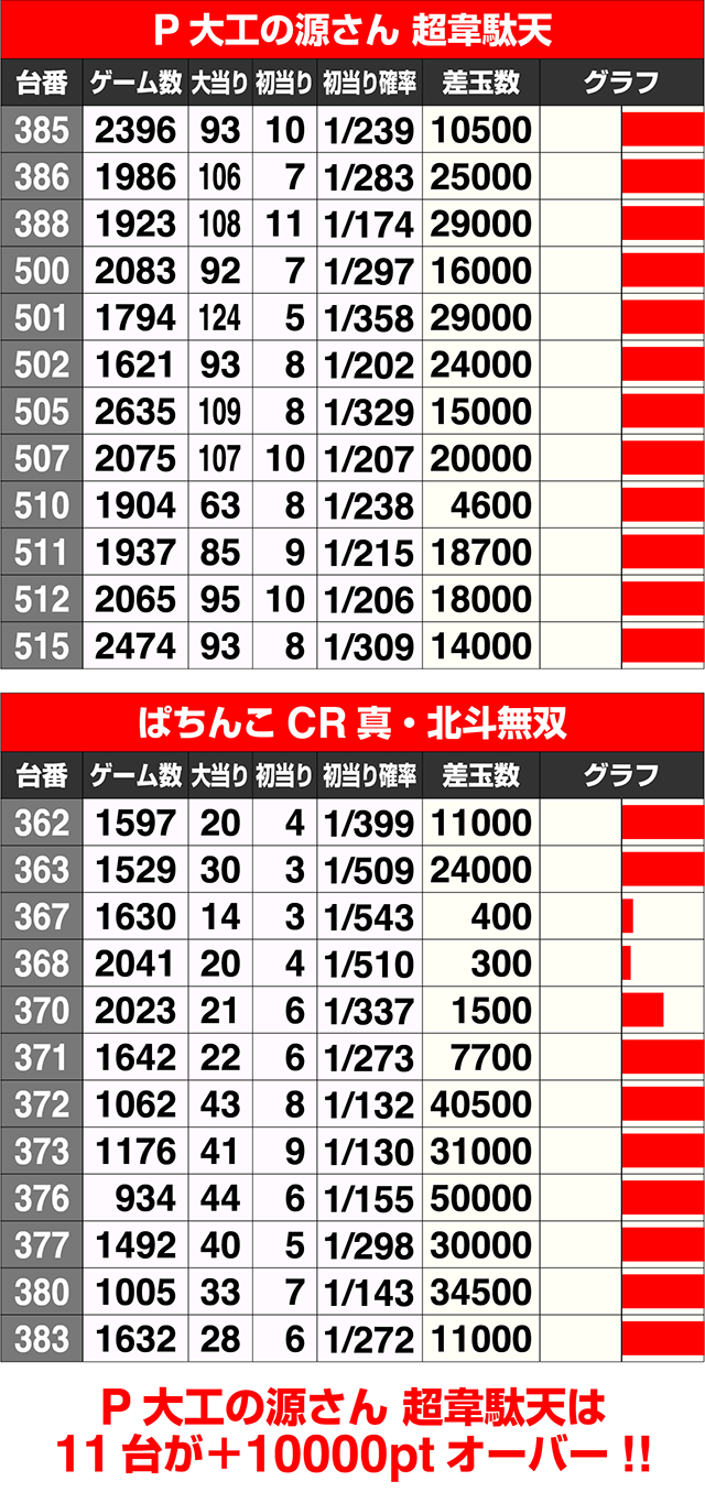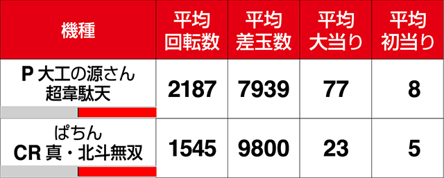 『P大工の源さん 超韋駄天』は18台中12台がプラスで、平均差玉は+7939pt。