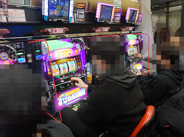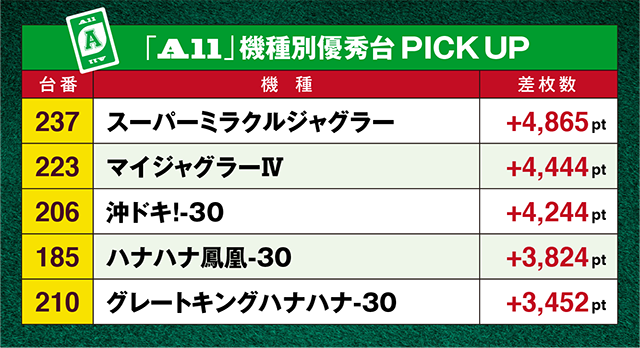 まとまって設置されているジャグラーシリーズでは、「スーパーミラクルジャグラー」の237番台と「マイジャグラーⅣ」の223番台が4000ptを上回ってこの日を終えていた。