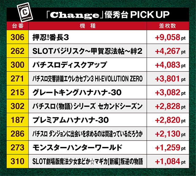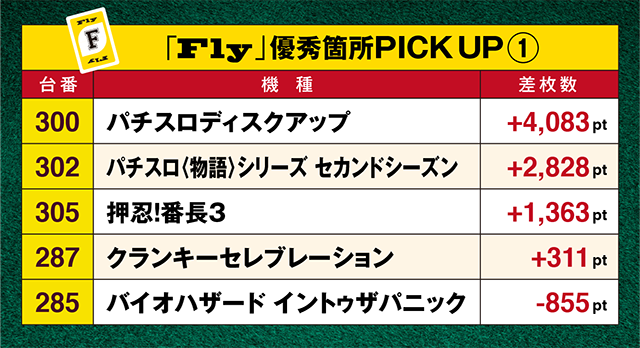 「パチスロディスクアップ」の300番台と「パチスロ〈物語〉シリーズ セカンドシーズン」の302番台、そして「押忍!番長3」の305番台が、飛び飛びで+1000pt以上を記録した。