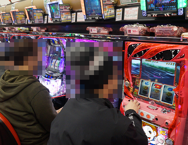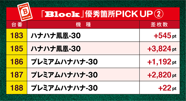 並びで設置された「ハナハナ鳳凰-30」と「プレミアムハナハナ-30」は、3824ptを含めて5台にプラスが連なった。